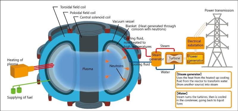 與使用核裂變技術的傳統核電廠不同,核聚變需要的是氘或氦-3(氫與氦的同位素),海水有大量的氘,而月球表面有大量的氦-3,原料來源較鈾豐富得多。