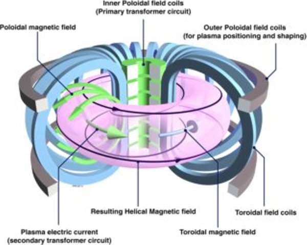 不存在可以承受與這種熱量直接接觸的材料。 因此,為了在實驗室中實現聚變,科學家們設計了一種解決方案,其中將過熱氣體或等離子體保持在環形磁場內。