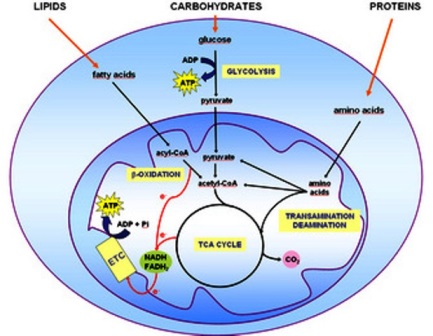 脂類、蛋白質和碳水化合物的降解分別產生脂肪酸、氨基酸和丙酮酸。 這些分子進入線粒體中的三羧酸 (TCA) 循環,被完全氧化為 CO2,同時 NAD+ 和 FAD 分別還原為 NADH 和 FADH2。 在電子傳遞系統中,電子從還原的輔酶傳遞到 O2,導致 ATP 合成。