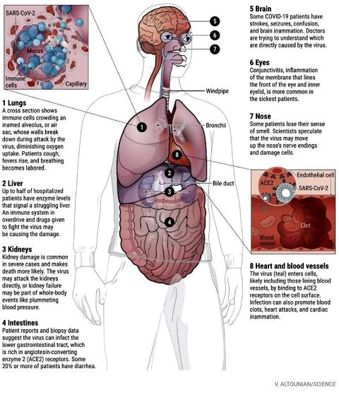 截止到目前,全球確診COVID-19的病例已超過220萬,死亡人數超過15萬,從新冠病毒爆發開始,臨床醫生和病理學家們就一直在努力了解冠狀病毒入侵人體後帶來的損害, 他們發現,儘管肺部是病毒的中心引爆點,但其覆蓋範圍可以擴展到其他器官,包括心臟、血管、腎臟、腸、大腦等。