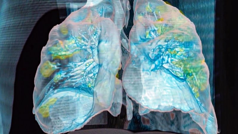 在基於計算機斷層掃描的3D模型中可以看到,一位因冠狀病毒死於喬治華盛頓大學的59歲男子,他的肺部受到了嚴重損傷(黃色部分)。 圖源:華盛頓醫院和外科手術室