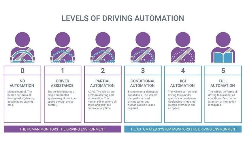 雖然我們還沒有達到L4級或L5級自動駕駛汽車的水平,但我們已經很接近了。 為了解釋每個級別的含義,下面是一個很棒的圖表: