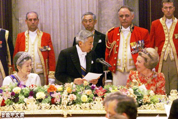 日本明仁天皇在晚宴上致辭,右邊為荷蘭貝婭特麗克絲女王(2000年5月,阿姆斯特丹王宮)