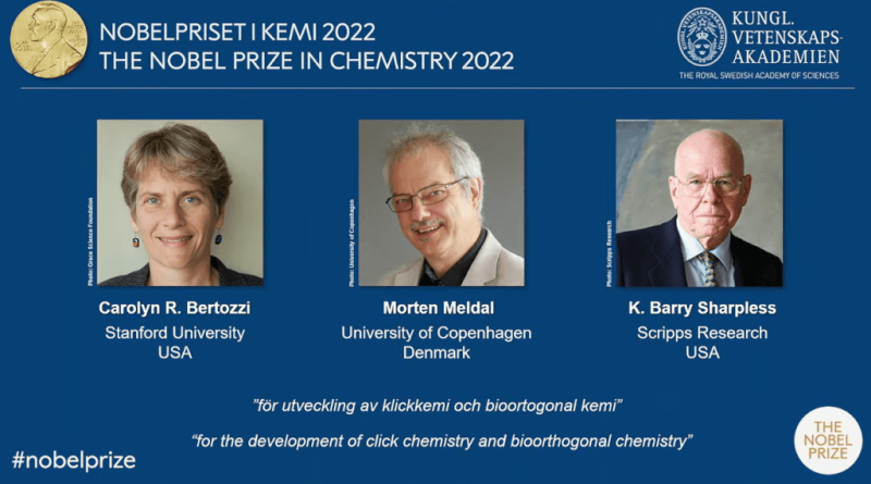 瑞典皇家科學院秘書長艾利格倫(Hans Ellegren)今天在斯德哥爾摩卡洛林斯卡研究所(Karolinska Institute)宣布,2022年諾貝爾化學獎由美國史丹佛大學教授柏托齊(Carolyn R. Bertozzi)、丹麥哥本哈根大學教授梅爾達爾(Morten Meldal)與美國斯克里普斯研究所(Scripps Research Institute)學者夏普里斯(K. Barry Sharpless)共同獲得。