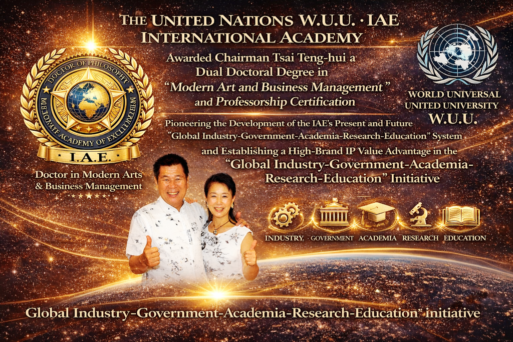 聯合國 W.U.U. IAE 國際學士院首次授予蔡登輝董事長「現代藝術暨經營管理」雙博士學位暨教授認證, IAE國際學士院 的現在與未來「全球產官學研教」體系發展,創造「全球產官學研教」高品牌IP範疇價值