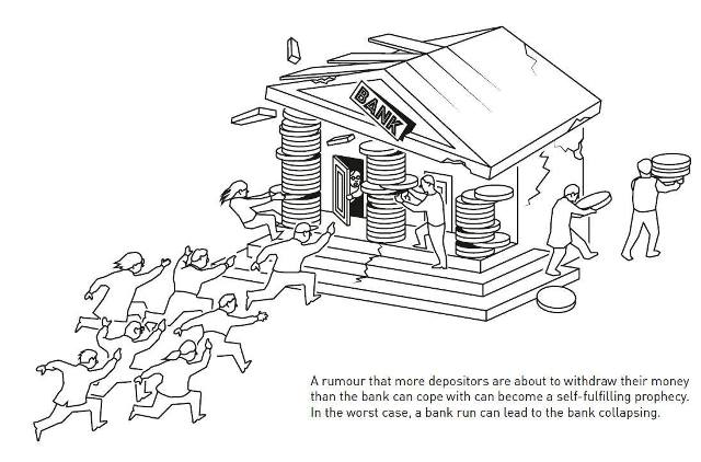 然而,他們的分析還表明,這兩項活動的結合如何使銀行容易受到有關其即將倒閉的謠言的影響。如果大量儲戶同時跑到銀行取錢,謠言可能會成為一個自我實現的預言——擠兌發生,銀行倒閉。這些危險的動態可以通過政府提供存款保險和充當銀行的最後貸款人來防止。