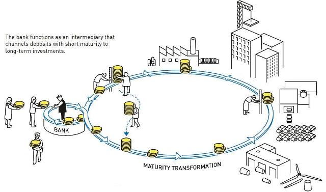 Diamond 和 Dybvig 表明,這個過程是銀行創造流動性的方式。存款人賬戶中的資金是銀行的負債,而銀行的資產則包括長期項目的貸款。銀行的資產期限很長,因為它向借款人保證他們不需要提前償還貸款。另一方面,銀行的負債期限較短;儲戶可以隨時取用他們的資金。銀行是把長期限資產轉變成短期限銀行賬戶的中介機構。這通常稱為成熟度轉換。