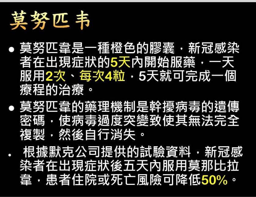 美國食品藥物管理局(FDA)正在研擬批准莫納皮拉韋的緊急使用授權,該藥在臨床試驗中證實,若在病患感染病毒初期投藥,重症和死亡風險將減半。