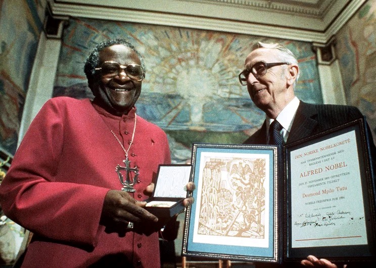 South African Bishop Desmond Tutu (left) receives the 1984 Nobel Peace Prize from Nobel Committee Chairman Egil Aarvik during the annual ceremony in Oslo, Norway, in 1984. Helmuth Lohmann/AP