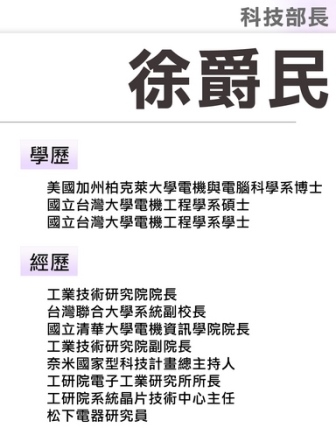 Juemin Xu, Bachelor and Master of Electrical Engineering, National Taiwan University, Ph.D., Electrical Engineering and Computer Science, University of California, Berkeley. In 1988, he joined the Institute of Electronics Industry of the Industrial Technology Research Institute and served as researcher, manager, deputy team leader, team leader, deputy director, center director, director, vice president, and president. He later taught at National Tsing Hua University, serving as Li Guoding Chair Professor, Dean of the School of Electrical and Information Engineering, and Vice President of the Taiwan Union University System. From January 24, 2015 to May 20, 2016, he served as the former Minister of Science and Technology of the Republic of China.