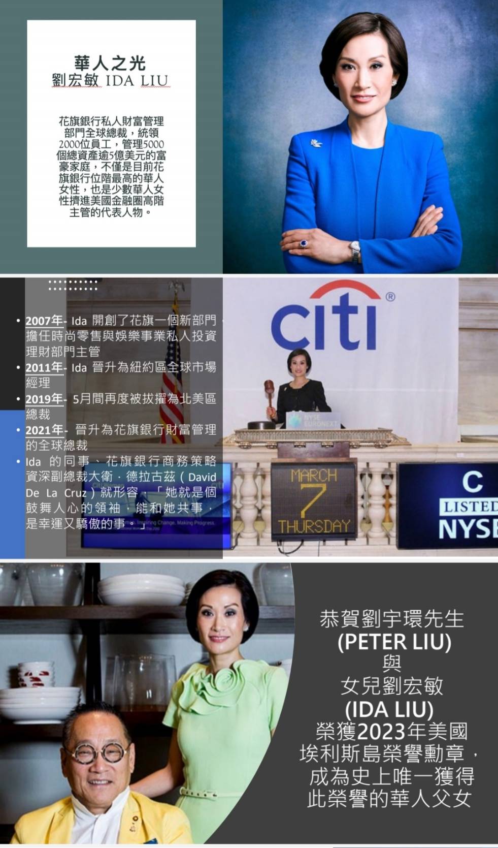 是花旗私人銀行全球主管,也是花旗全球財富管理領導團隊成員。Ida 在 50 個國家/地區的 18 個辦事處領導私人銀行業務,為全球超高淨值家庭及其業務提供財富管理解決方案。在成為全球負責人之前,她是花旗私人銀行北美的負責人,並擔任過許多其他領導職務。 Ida 創建了花旗私人銀行的北美亞洲客戶集團,她的職業生涯始于花旗,創立並領導時尚、零售和娛樂集團。在加入花旗之前,Ida 曾在女裝設計公司 Vivienne Tam 擔任全球銷售、行銷、公共關係和業務發展主管。在此之前,Ida 曾在美林證券的並購以及紐約和香港的技術、媒體和電信投資銀行集團從事投資銀行工作七年。她的職業生涯始於BT Wolfensohn(現為德意志銀行)的並購。 艾達獲得了許多行業榮譽,包括《巴倫週刊》財富管理領域最具影響力的10位女性、《巴倫週刊》的《美國金融界100位最具影響力的女性》、《克萊恩》的《華爾街著名女性》和《美國銀行家》雜誌的《25位金融界最具影響力的女性》。此外,Ida 還是全球青年領袖 (YGL) 世界經濟論壇成員,100人委員會(C100)和青年總裁組織(YPO)成員。Ida在加州大學洛杉磯分校健康諮詢委員會和亞洲協會董事會任職。 Ida 擁有威爾斯利學院的榮譽學士學位和賓夕法尼亞大學沃頓商學院的 MBA 學位。她能說流利的普通話、西班牙語和俄語。