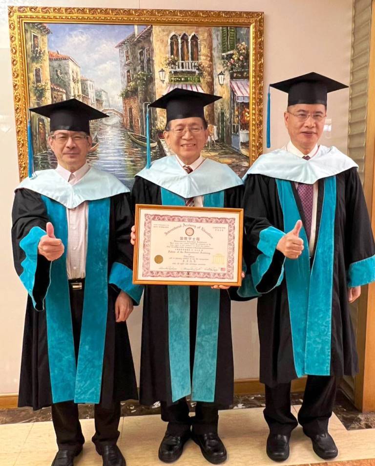 上市公司 中國砂輪企業 「全球Top1 再生晶圓」 白文亮副董事長(中) 榮獲頒 聯合國 W.U.U 350年傳承IAE美國國際學士院「企業經營管理教授」由真理大學陳奇銘校長(左)及 IAE美國國際學士院 亞洲總部陳校長(右)共同榮頒見證與12萬分祝賀 2023.04.06 (↑詳細內容 敬請點入)