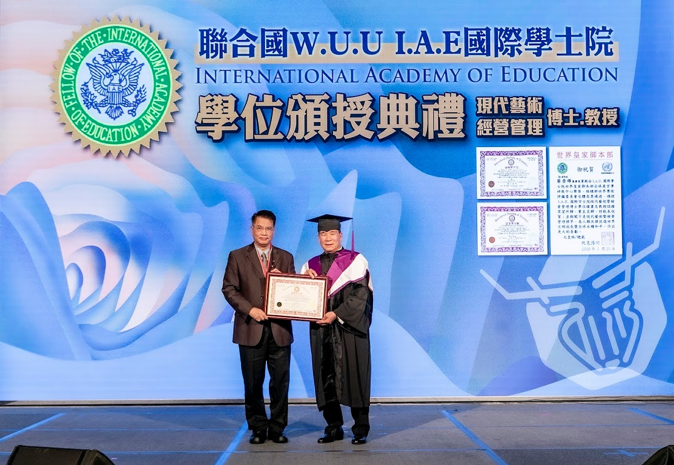 聯合國(W.U.U )IAE國際學士院「審議、評鑒全球產官學研政教之高端人才或 Top1 領導人,並授予碩博士學位或教授資格」